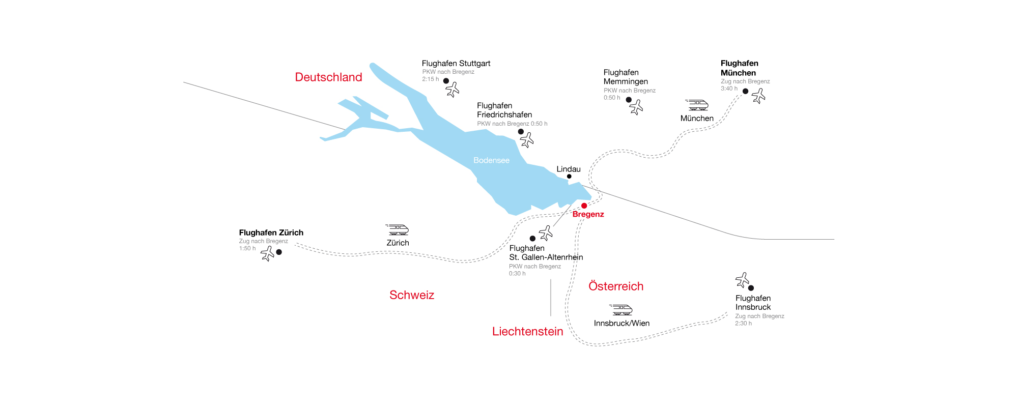 Für eine zeitsparende Anreise internationaler Teilnehmer:innen stehen drei Flughäfen zur Wahl, die von Bregenz aus in kurzer Zeit per Bahn oder Shuttlebus erreichbar sind.