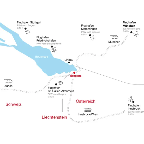 For a time-saving journey, international participants can choose from three airports that are easily accessible from Bregenz by train or shuttle bus.