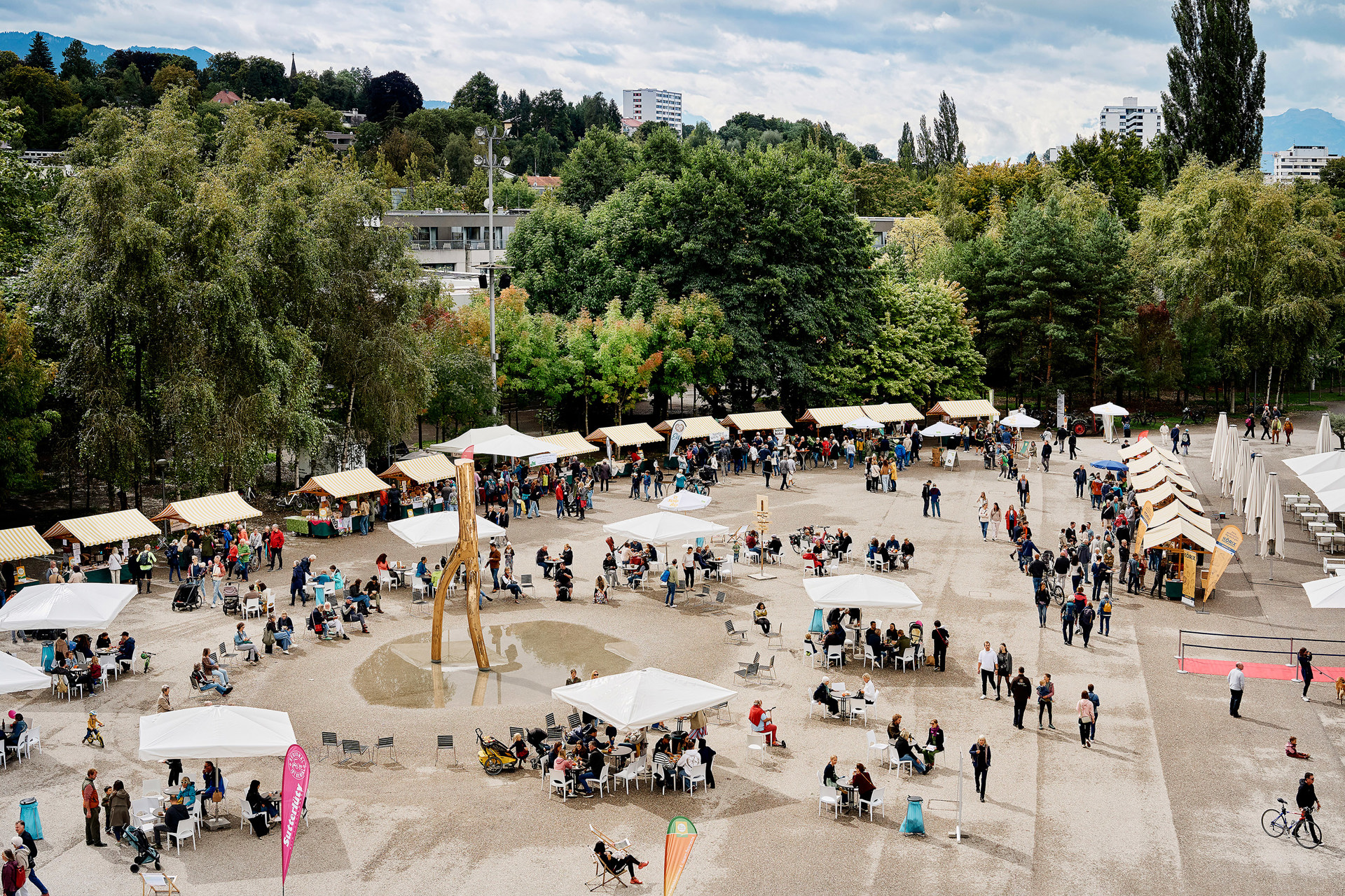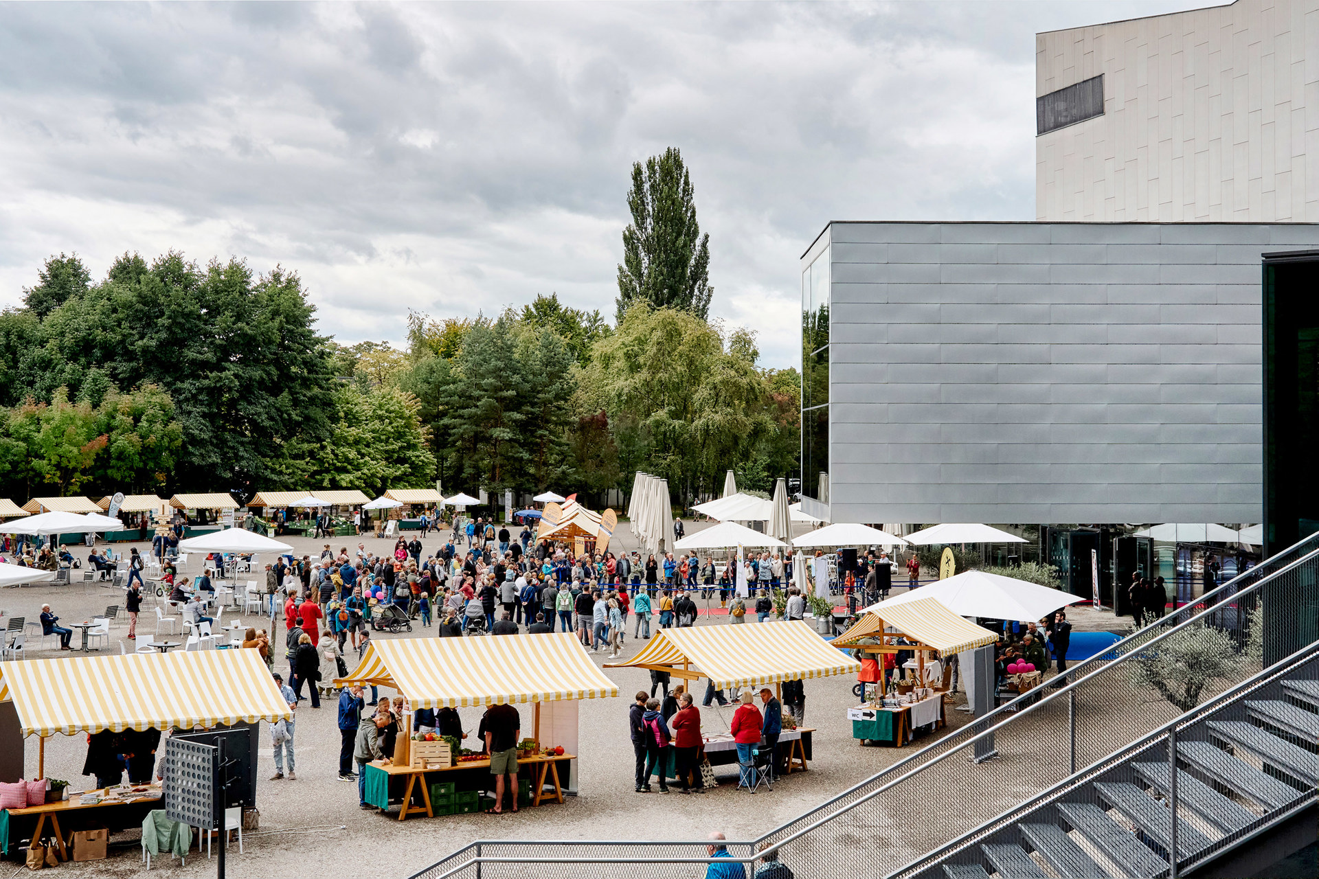 In den Sommermonaten Juli und August verwandelt sich der Platz in eine lebendige Plaza mit großem Gastronomieangebot für die Gäste der Bregenzer Festspiele.